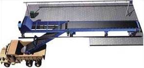 水泥裝車機由平形膠帶機、卸袋機構、端部溜槽等組成。平形膠帶機的支架采用鋼板折彎結構,即美觀又牢固;驅動裝置采用擺線針輪減速機,節省占地面積;張緊方式為中間垂直卸下時,立式膠帶機處于包裝膠帶機的側邊;當需要水泥袋從中間位置卸下時,由電動推桿拉動立 式膠帶機使其擺動與包裝膠帶機縱向成交叉位置,并開動立式膠帶機即可。立式膠帶機的兩個擺動極限位置限位開關,其在工作和非工作狀態下的定位由限位開關來實現。特殊設計的溜槽能使水泥袋恰好落到接續膠帶機的中心位置。
