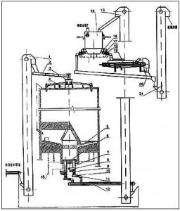 MF生料均化庫的生料采用分配器和六根斜槽呈輻射狀卸入庫內,基本形成水平料層,庫底是錐形,略向中心傾斜,中部有一中心混合室,中心室與庫壁之間的均化庫庫底分為6-14個充氣區,每區設3條充氣斜槽和3個卸料孔,卸料時向兩相對區輪流充氣,在卸料中上方出現多股漏斗凹陷,漏斗沿直徑排成一列,隨充氣的交換而旋轉角度,這樣不但產生重力混合,而且生料從庫底卸入中心室后,中心室底部連續充氣,使生料又獲一次均化,由于這種庫的均化原理是以料流重力混合為主要手段,所以電耗極省,能耗僅為0.432~0.576Mj/t,均化值H可達7-10,該系統具有高效節能,基建投資低和操作管理簡便等優點。